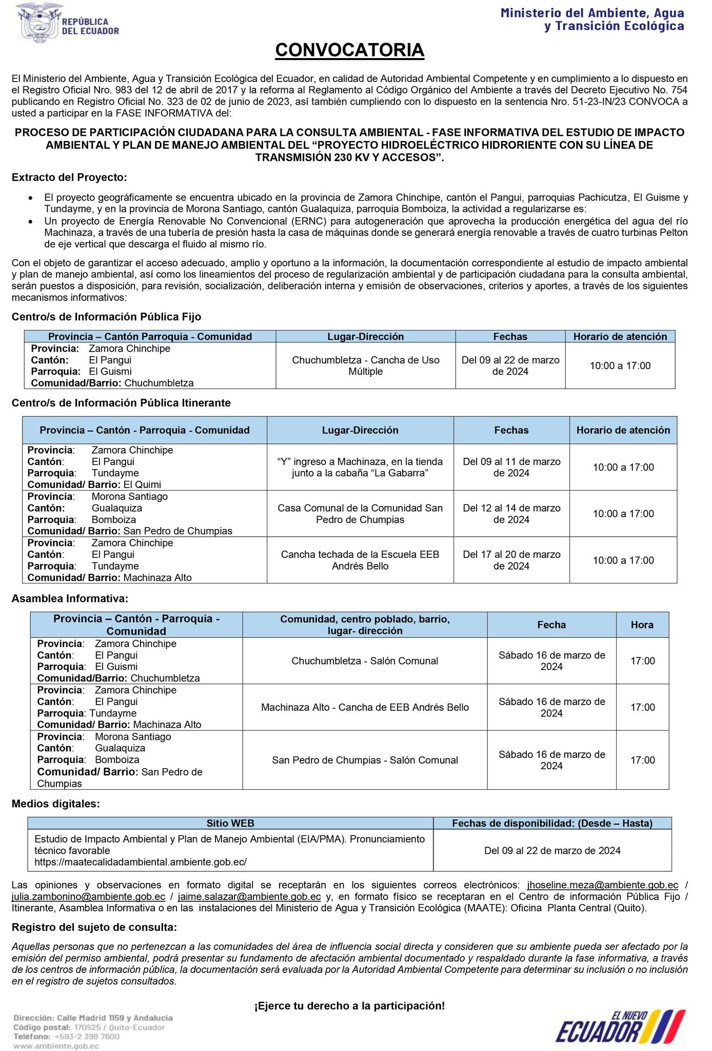 PROCESO DE PARTICIPACIÓN CIUDADANA PARA LA CONSULTA AMBIENTAL - FASE INFORMATIVA DEL ESTUDIO DE IMPACTO AMBIENTAL Y PLAN DE MANEJO AMBIENTAL DEL “PROYECTO HIDROELÉCTRICO HIDRORIENTE CON SU LÍNEA DE TRANSMISIÓN 230 KV Y ACCESOS”.